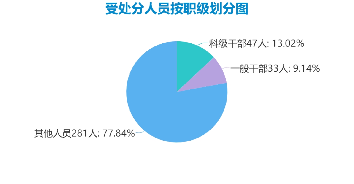 在给予党纪政务处分的361人中,涉及科级干部47人,占比13.02%;一般干部33人,占比9.14%;其他人员281人,占比77.84%。