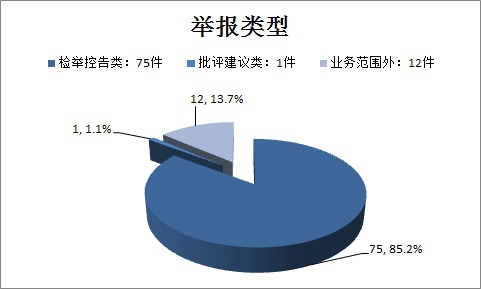 在直接受理的88件信访举报件中,按举报类型分:检举控告类75件,占比85.2%;批评建议类1件,占比1.1%;业务范围外12件,占比13.7%。