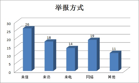 在直接受理的88件信访举报件中,按举报方式分:来信26件,占比29.5%;来访18件,占比20.5%;来电14件,占比15.9%;网络举报19件,占比21.6%;其他11件,占比12.5%。