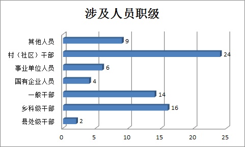 在75件检举控告类信访举报件中,按涉及人员职级分:县处级干部2件,占2.7%;乡科级干部16件,占21.3%;一般干部14件,占18.7%;国有企业人员4人,占5.3%;事业单位人员6人,占8%;村(社区)干部24件,占32%;其他人员9件,占12%。