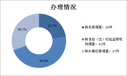 在直接受理的88件信访举报件中,按办理情况分:转本委调查20件,占22.7%;转派驻(出)纪检监察机构调查41件,占46.6%;转乡镇纪委调查27件,占30.7%。
