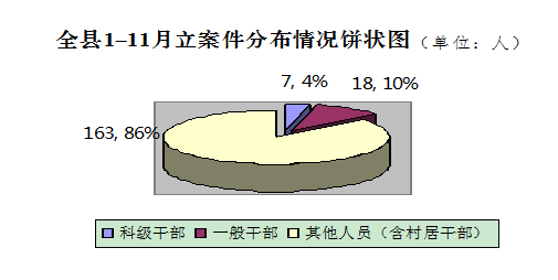 1-11月,全县共办理立案188件,其中科级干部7人,占11.6%;一般干部18人,占20%;其他人员163人,占68.4%。
