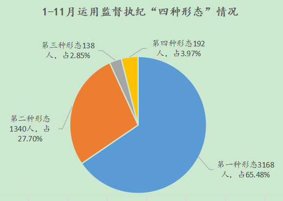1-11月,全市纪检监察系统共运用监督执纪“四种形态”处理4838人次,其中“第一种形态”3168人次,占65.48%;“第二种形态”1340人次,占27.70%;“第三种形态”138人次,占2.85%;“第四种形态”192人次,占3.97%。