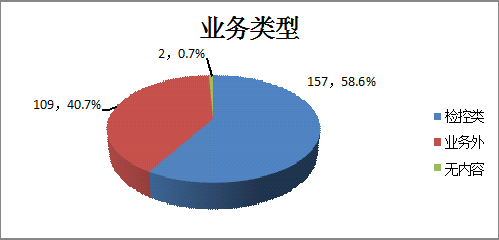 从业务类型看,检控类157件,占比58.6%,业务范围外109件占比40.7%,无实质内容2件,占比0.7%。
