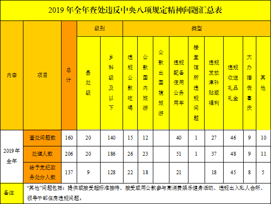 从问题查处的类型看:在查处的160起问题中,违规公款吃喝15起,占9.4%;公款国内旅游12起,占7.5%;违规配备使用公务用车40起,占25%;楼堂馆所违规问题1起,占0.6%;违规发放津补贴或福利27起,占16.9%;违规收送礼品礼金46起,占28.8%;大办婚丧喜庆9起,占5.6%;其他10起,占6.2%。没有发现公款出国境旅游问题。