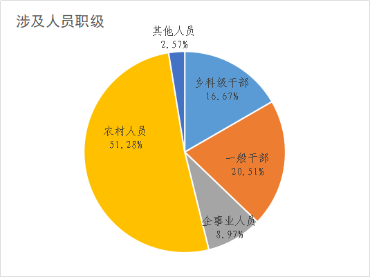 在检举控告类信访举报件中,按涉及人员职级分:乡科级干部13件,占16.67%;一般干部16件,占20.51%;企事业人员7件,占8.97%;农村人员40件,占51.28%;其他人员2件,占2.57%。(宣城市纪委监委)