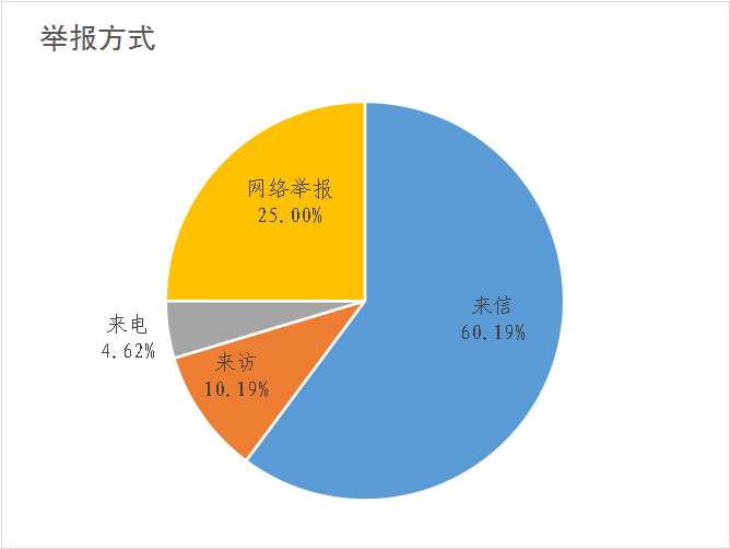 在本级直接受理108件信访举报件中,按举报方式分:来信65件,来访11件,来电5件,网络举报27件,分别占60.19%、10.19%、4.62%、25%。
