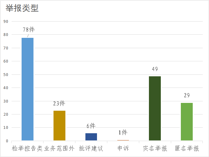 按举报类型分:检举控告类78件,业务范围外23件,批评建议6件,申诉1件,分别占比72.22%、21.29%,5.56%,0.93%。在检举控告类信访举报件中,实名举报49件,匿名举报29件,分别占62.82%、37.18%。