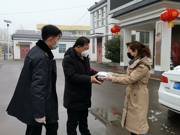 杜集区纪委监委对全区各部门、镇村执行疫情防控工作纪律情况进行监督检查,并送去关心关怀。图为杜集区纪检监察干部赴石台镇白顶山村向防疫一线工作者送上口罩等防疫用具。