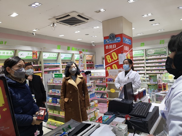 相山区纪委监委行业督查组针对防控医药用品热销现象,重点督查医用口罩、消毒药剂等供应和价格变动情况。图为督查组到辖区内各大药房实地了解市民12315热线反映口罩、消毒药剂涨价问题市场监管所办理情况。