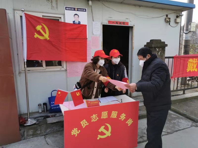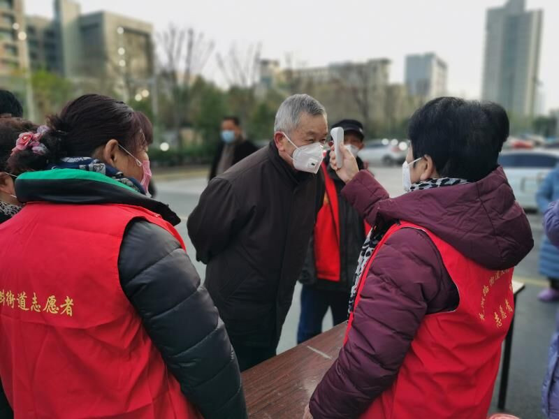芜湖路街道太湖新村小区党支部组织党员当好监督员,为进入太湖新村小区居民测量体温。