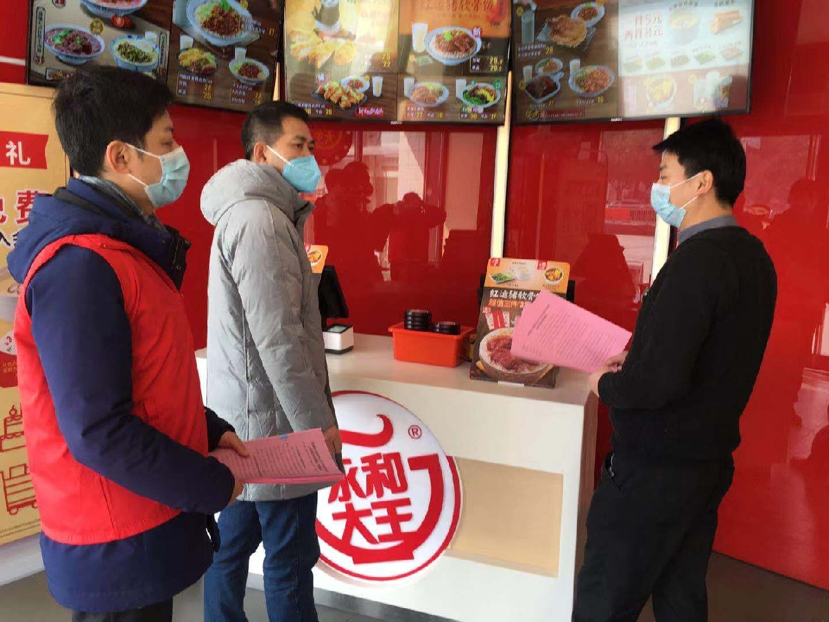 芜湖路街道纪工委工作人员与志愿者一道向开门商家宣传省市关于延迟企业复工相关精神。