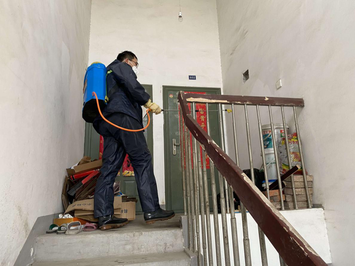 淝河镇关镇村纪检委员在辖区关镇佳园小区楼道进行消毒。
