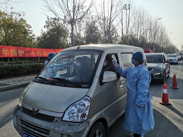 官亭镇在与外市交界处设置监测点,安排人员对外来人员进行体温检测。(刘洋/摄)