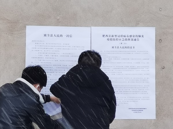 高店乡各村居纪检委员顶风冒雪,及时张贴公布疫情最新情况。(赵勇/摄)