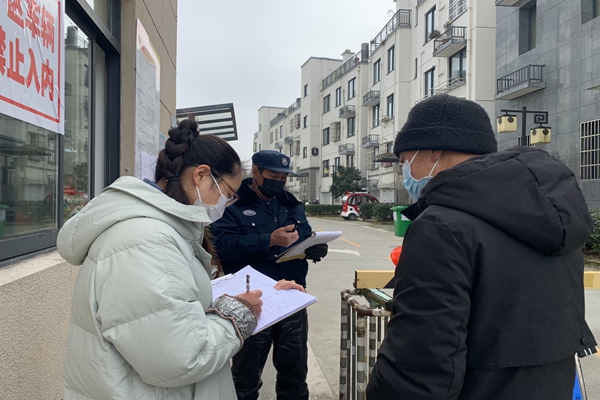 图为纪检监察干部协助社区人员摸排居民近期出行信息。