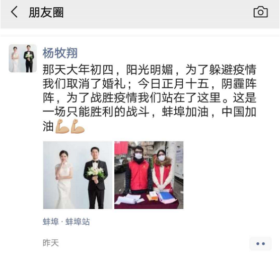 “那天大年初四,阳光明媚,因为疫情,我们取消了婚礼;今日正月十五,阴霾阵阵,为了战胜疫情,我们站在了这里。这是一场只能胜利的战斗,蚌埠加油,中国加油!”