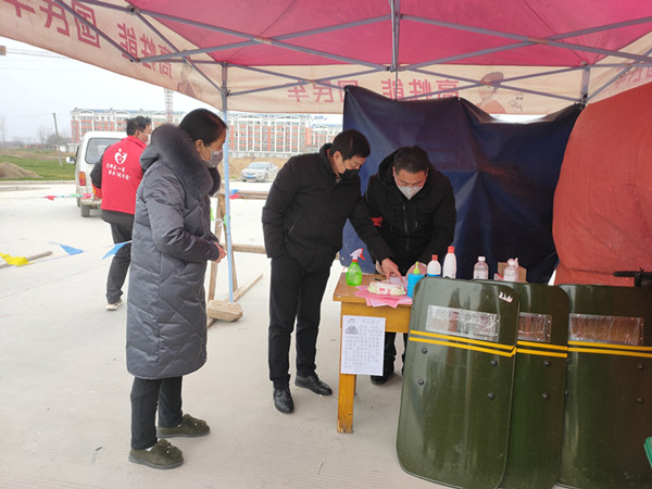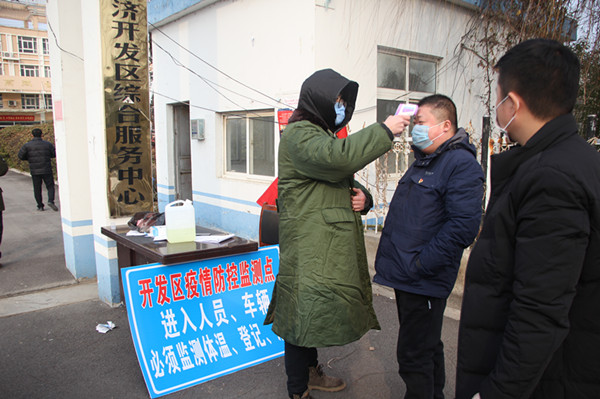 深入经济开发区督查防控措施落实期间,县监督检查组工作人员接受监测体温、登记、消毒。