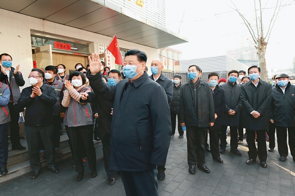2020年2月10日,中共中央总书记、国家主席、中央军委主席习近平在北京调研指导新冠肺炎疫情防控工作。这是习近平来到朝阳区安贞街道安华里社区,了解基层一线疫情联防联控情况。 新华社记者 鞠鹏/摄