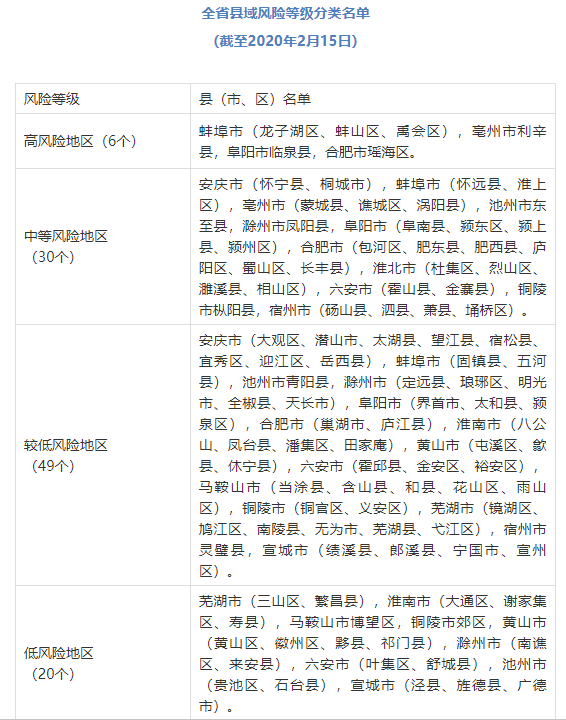 2月15日,安徽省新型冠状病毒肺炎疫情防控应急综合指挥部印发了《关于分区分级实施差异化新冠肺炎疫情防控措施的通知》。全文如下: