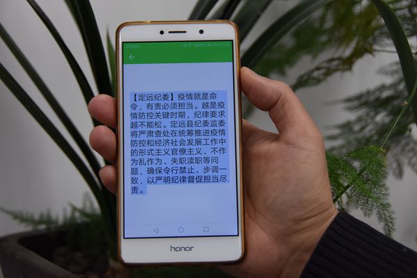 围绕疫情抓宣传。“疫情就是命令,有责必须担当。越是疫情防控关键时期,纪律要求越不能松。”疫情防控期间,全县党员干部经常会收到县纪委监委发送的短信。县纪委监委利用手机短信、网站、微信公众号等媒介,围绕“疫情发展态势、不听谣不信谣、党员干部应该怎么做?”等热点开展宣传。号召全县党员干部带头示范,出门戴口罩、不走亲访友、不聚会聚餐、不宴请宾客、不信谣传谣。截止目前,围绕疫情防控推送微信 90余条,网站刊文120余篇,发送短信1000余条。