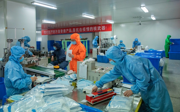 河南省郏县纪委监委主动监督、靠前监督,督促县工信局、卫健委等部门落实落细监管责任,确保圣光医用制品股份有限公司用工需求跟得上、原料供给不断档,开足马力、源源不断向武汉输送医用口罩、防护服等医疗物资。(河南省郏县纪委监委 李利国 摄)