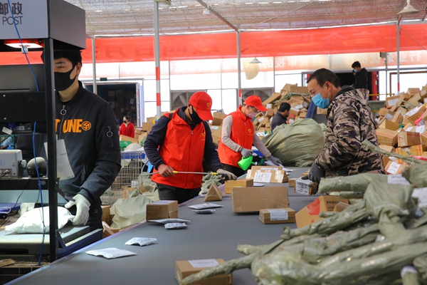 江苏省沭阳县新河镇党员干部自发成立志愿者服务队,协助全镇快递企业开展经营场所、快件包裹消毒工作,为全镇1.1万家网店每日50余万订单高效、科学、有序、安全发货提供保障。(江苏省沭阳县纪委监委 范晶晶 摄)