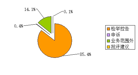 信访举报问题分类情况:检举控告类1008件次,占85.4%;申诉5件次,占0.4%;业务范围外166件次,占14.1%,批评建议1件次,占0.1%。
