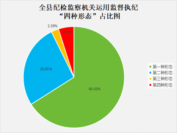 全县纪检监察机关精准运用监督执纪“四种形态”处理1257人次,其中运用第一种形态处理830人次,占比66.03%;第二种形态处理335人次,占比26.65%;第三种形态处理30人次,占比2.39%;第四种形态处理62人次,占比4.93%。