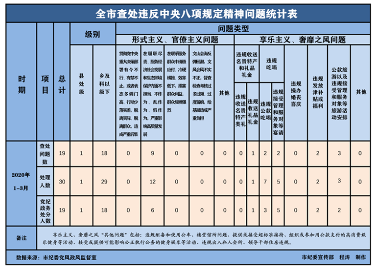 巩固拓展落实中央八项规定精神成果,坚持不懈改进作风,铜陵市纪委监委在全市纪检监察机关建立了查处违反中央八项规定精神问题月报制度。2020年1-3月份,全市查处违反中央八项规定精神问题情况如下: