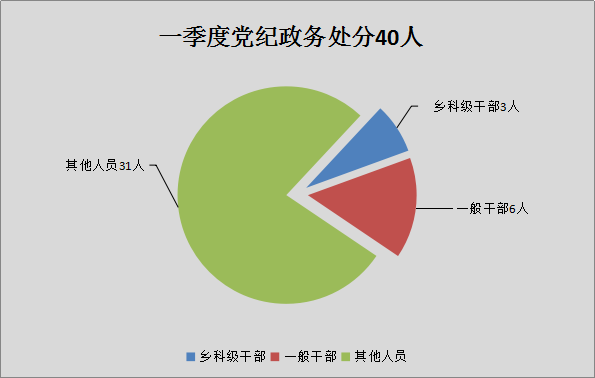 受到党纪政务处分的40人中:乡科级干部3人,占比7.5%;一般干部6人,占比15%;其他人员31人,占比77.5%。