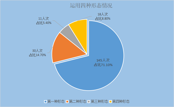 其中,运用第一种形态处理145人次,占71.1%;第二种形态30人次,占14.7%;第三种形态11人次,占5.4%;第四种形态18人次,占8.8%。
