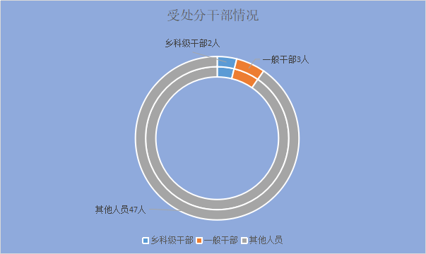 受处分人员中,其中乡科级干部2人,占3.8%,一般干部3人,占5.8%,其他人员47人,占90.4%。