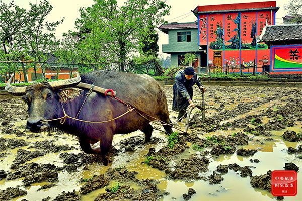 一犁膏雨润新田。地处云贵高原的贵州省铜仁市石阡县龙塘镇大屯村村民,正趁着丰沛的雨水抓紧翻犁种植水稻的秧田。(贵州省铜仁市石阡县纪委监委供 张林 摄)