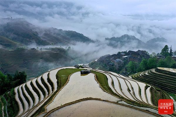 立夏,正是广西壮族自治区桂林市龙胜各族自治县龙脊梯田全面灌水的时节,也即将开启一年当中最美的时光。雨后,层层梯田在云雾间若隐若现,宛如天空之镜,令人陶醉。(广西壮族自治区桂林市龙胜各族自治县纪委监委供 潘志祥 摄)