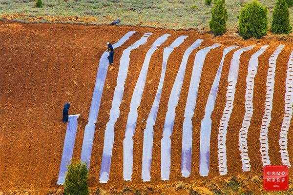 立夏前后温度适宜,正是烟田起垄覆膜的好时节。在河南省三门峡市陕州区,地处黄土高原东南缘的丘陵上,人们正用勤劳的双手铺设一年的希望。(河南省三门峡市陕州区纪委监委供 兀增刚 摄)