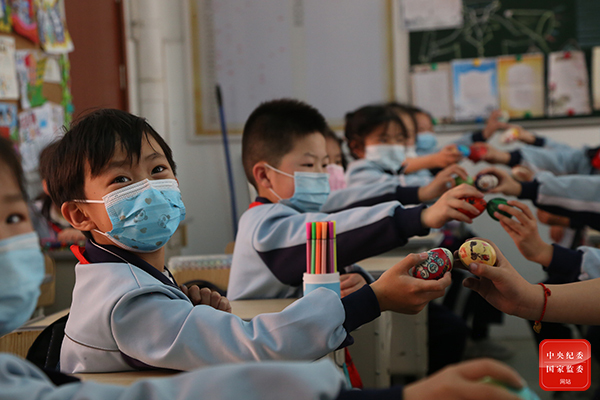 吃蛋、“碰蛋”是一些地区立夏的习俗。浙江省台州市仙居县第一小学将传统习俗与德育美育结合起来,学生们在蛋上写出“中国加油”并作画,表达对抗疫英雄的感恩、对伟大祖国的热爱。(浙江省台州市仙居县纪委监委供 吴鑫 摄)