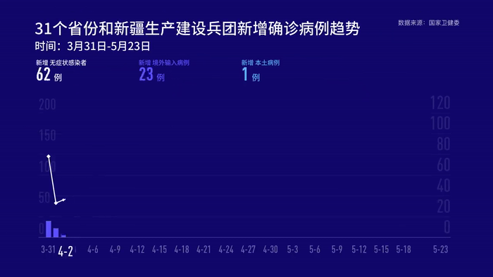 5月23日0—24时,31个省(自治区、直辖市)和新疆生产建设兵团报告新增确诊病例3例,其中境外输入病例2例(上海1例,广东1例),本土病例1例(在吉林);无新增死亡病例;新增疑似病例3例,均为境外输入病例(均在内蒙古)。
