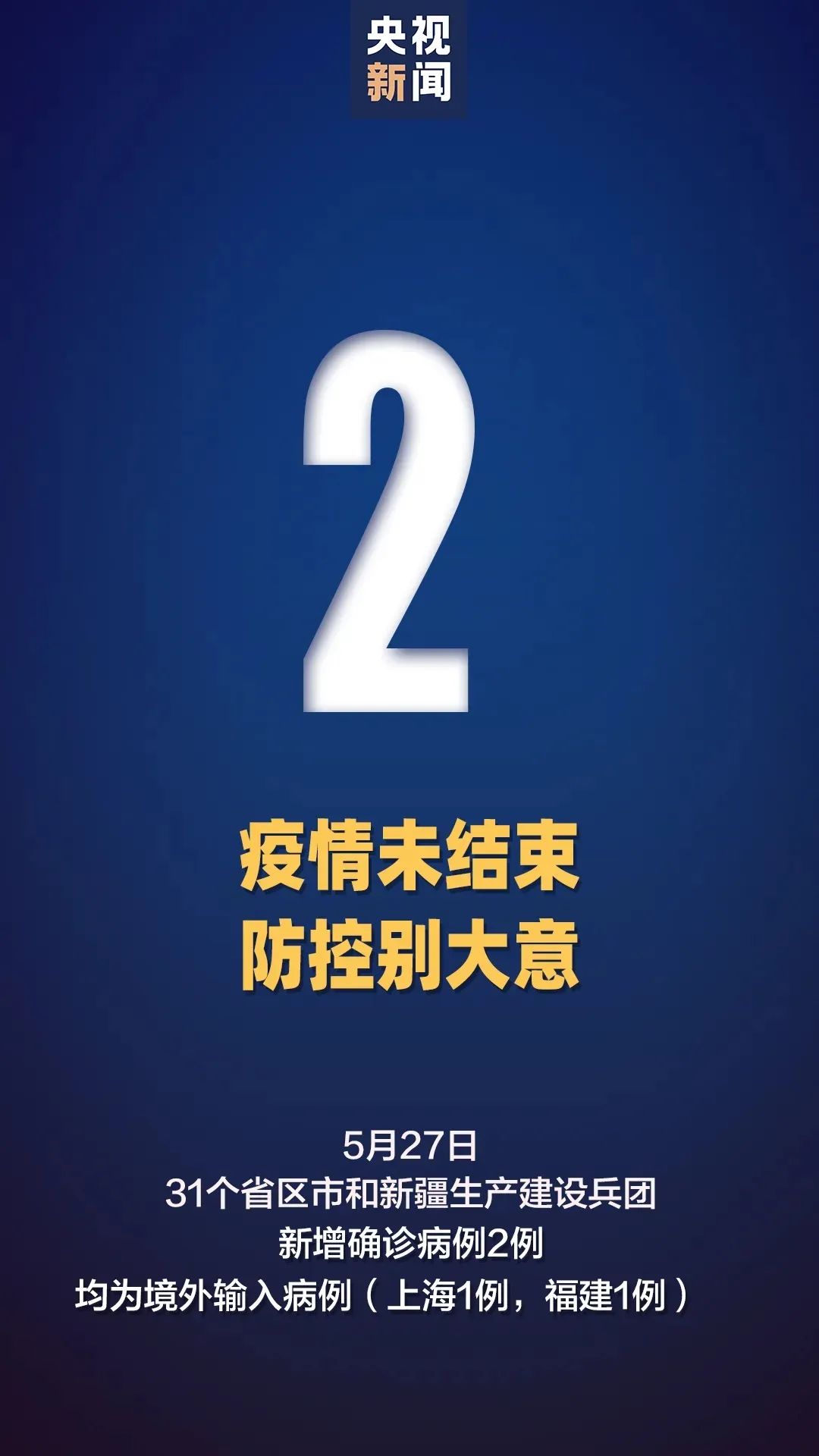 ●5月27日0—24时,31个省(区、市)和新疆生产建设兵团新增确诊病例2例,均为境外输入病例(上海1例,福建1例),全国连续4天无新增本土确诊病例。