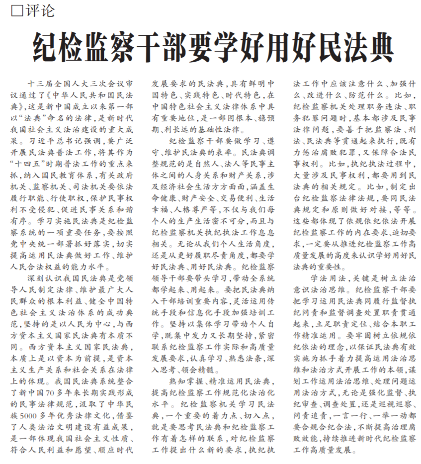 ●今天出版的中国纪检监察报头版发表评论《纪检监察干部要学好用好民法典》,评论指出,学习实施民法典是纪检监察系统的一项重要任务,要按照党中央统一部署抓好落实,切实提高运用民法典做好工作、维护人民合法权益的能力水平。