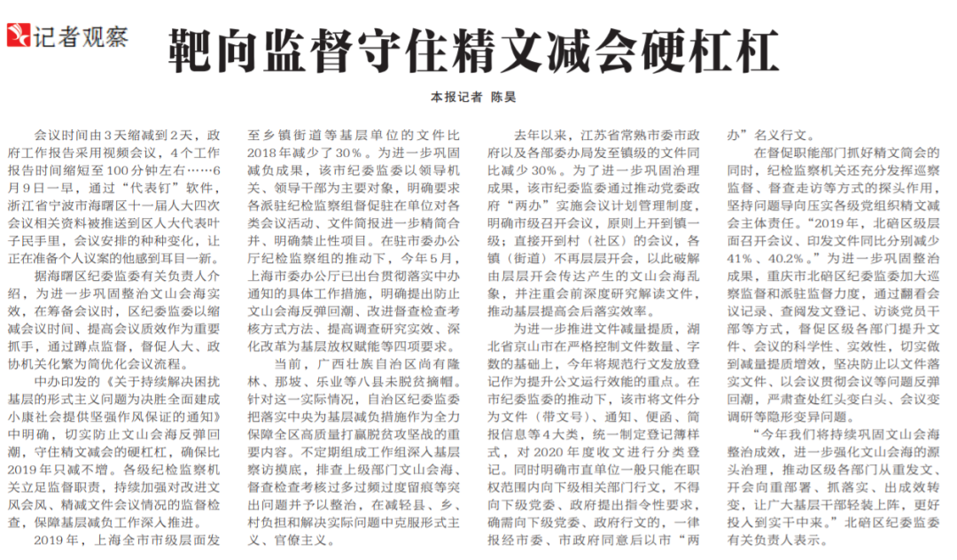 ●今天出版的中国纪检监察报头版发表记者观察《靶向监督守住精文减会硬杠杠》,报道了各级纪检监察机关持续加强对改进文风会风、精减文件会议情况的监督检查,保障基层减负工作深入推进。