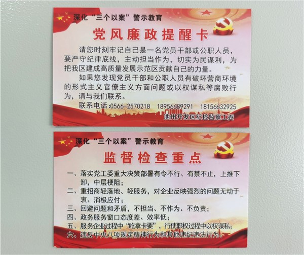 “收到这张提醒卡,我愈发感觉到开发区党工委从严治党的决心以及为我们企业营造良好营商环境的诚意,特别是看到卡片上印有纪检监察工委书记的手机号码,这为我们反映问题提供了直通车。”池州华宇电子科技有限公司负责人说道。
