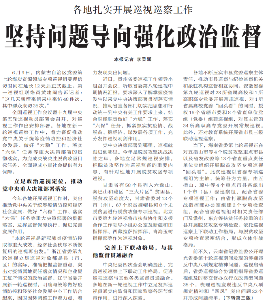 ●今天出版的中国纪检监察报头版以《坚持问题导向强化政治监督》为题,报道了各地扎实开展新一轮巡视巡察工作的情况。其中安徽省委第九轮巡视紧紧围绕教育系统职责使命,精准发现问题。