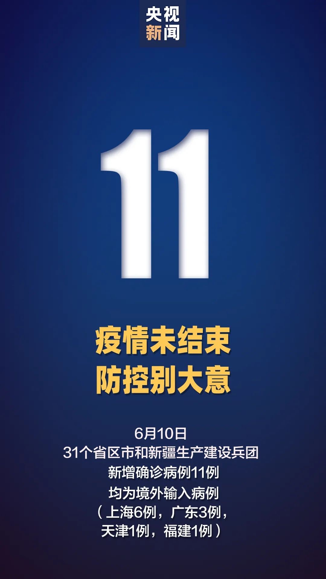 ●国家卫健委通报,6月10日,31个省(区、市)和新疆生产建设兵团单日新增境外输入确诊病例再次超过10例,对外防输入提出更大挑战。