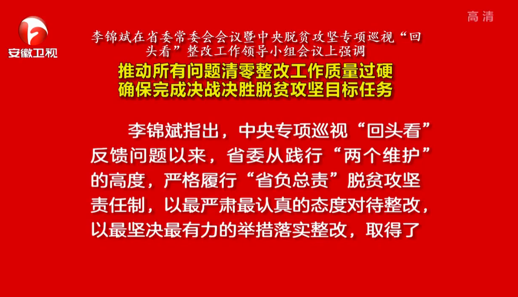 ●6月15日,省委书记李锦斌主持召开省委常委会会议暨中央脱贫攻坚专项巡视“回头看”整改工作领导小组会议,讨论《关于中央第十一巡视组对安徽省脱贫攻坚专项巡视“回头看”反馈意见整改落实进展情况的报告》。李锦斌强调:推动所有问题清零整改工作质量过硬,确保完成决战决胜脱贫攻坚目标任务。