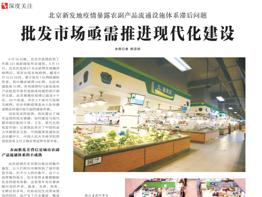 ●今天出版的中国纪检监察报深度关注栏目发表文章指出,北京新发地疫情不仅暴露出了批发市场脏乱差方面的问题,更折射出其低水平低层次运营的状态。城市批发市场亟需推进现代化建设。