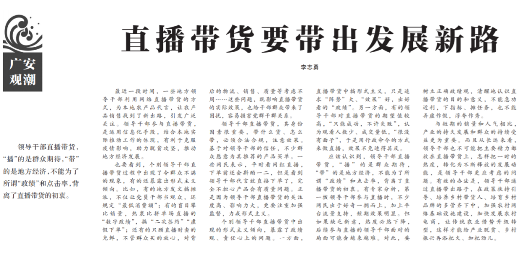 ●今天出版的中国纪检监察报《广安观潮》专栏发表评论《直播带货要带出发展新路》,批评个别领导干部直播带货过程中暴露出的形式主义倾向:例如发文摊派,用行政命令的方式来做直播;盲目攀比销量等。文章指出,与短期的销量和人气相比,产业的持久发展和群众的持续受益更为重要。从长远来看,领导干部也不可能把主要精力都放在直播带货上。