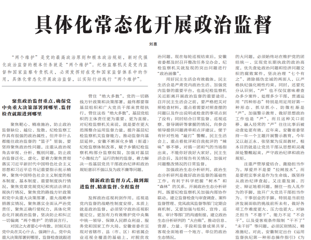 ●今天出版的中国纪检监察报发表安徽省委常委、省纪委书记、省监委主任刘惠的署名文章《具体化常态化开展政治监督》,文章指出,“两个维护”是党的最高政治原则和根本政治规矩,新时代强化政治监督的根本任务就是“两个维护”。纪检监察机关是党内监督和国家监察专责机关,必须发挥好在党和国家监督体系中的作用,具体化常态化开展政治监督,以实际行动践行“两个维护”。