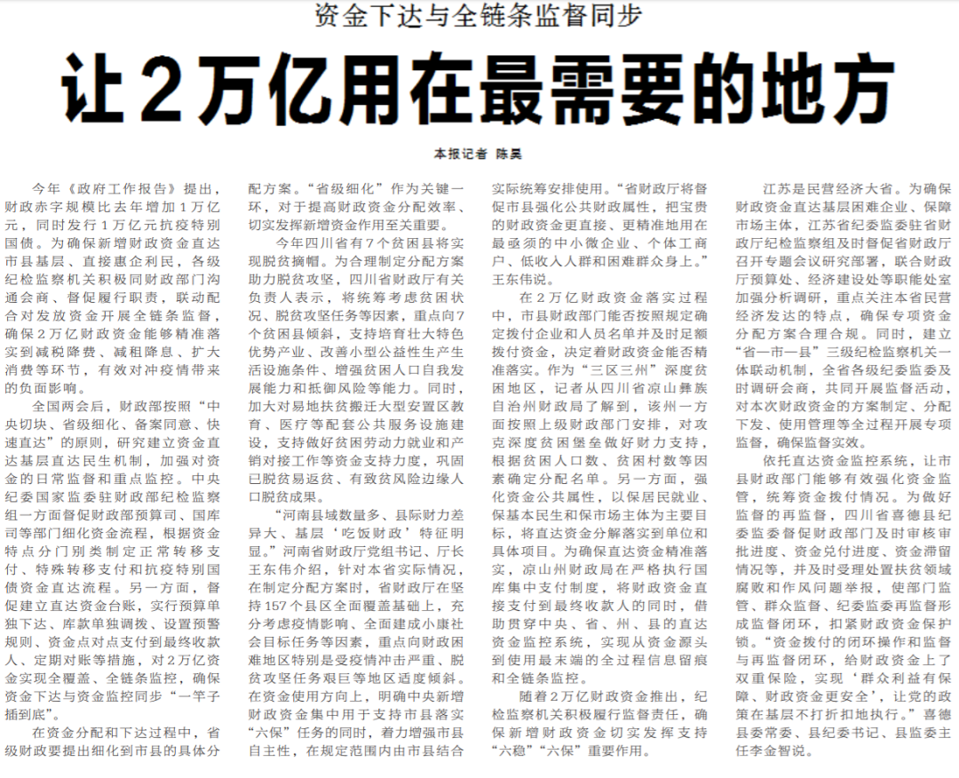 ●今天出版的中国纪检监察报头版头条以《让2万亿用在最需要的地方》为题,报道了各级纪检监察机关对发放资金开展全链条监督,确保2万亿财政资金能够精准落实到减税降费、减租降息、扩大消费等环节。文章指出,省级财政要提出细化到市县的具体分配方案。“省级细化”作为关键一环,对于提高财政资金分配效率、切实发挥新增资金作用至关重要。