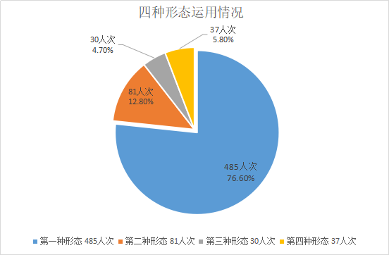 1-6月,运用“四种形态”处理633人次。其中运用第一种形态485人次,占比76.6%;第二种形态81人次,占比12.8%;第三种形态30人次,占比4.7%;第四种形态37人次,占比5.8%。